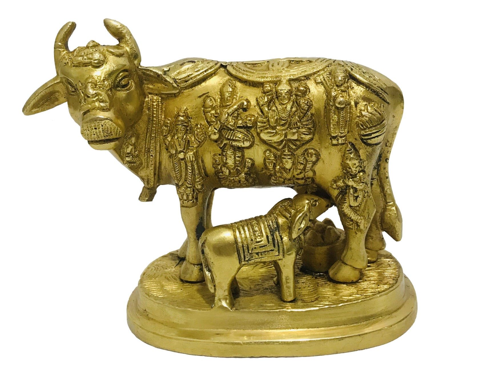 Brass Kamdhenu Cow with Calf Statue Idol for Good Luck, Prosperity Gift, Home Décor Sculpture